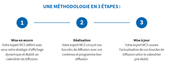 • Gestion de contenus : mise en forme des messages, programmation des contenus et actualisation régulières des boucles de diffusion.